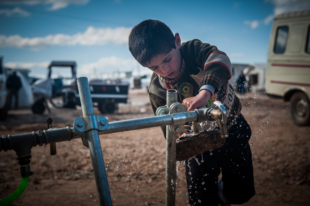 Ein Flüchtlingsjunge zapft Wasser